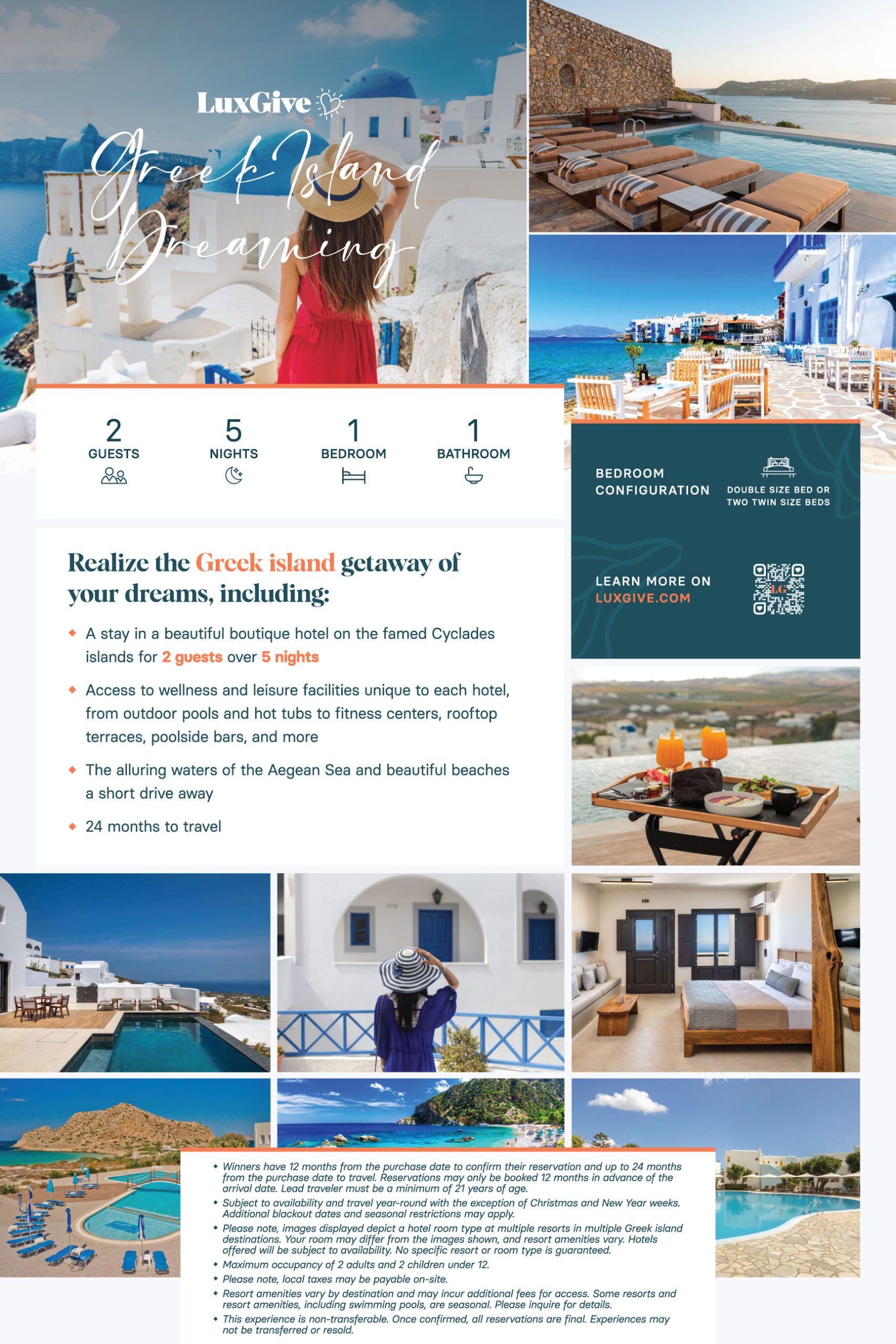 The lucky winner will choose between five nights for two adults on the picturesque shores of Greece, staying in a boutique hotel on the famed Cyclades Islands, or five nights in Hawaii at a beautiful tropical resort on Oahu, Maui, or the Big Island.