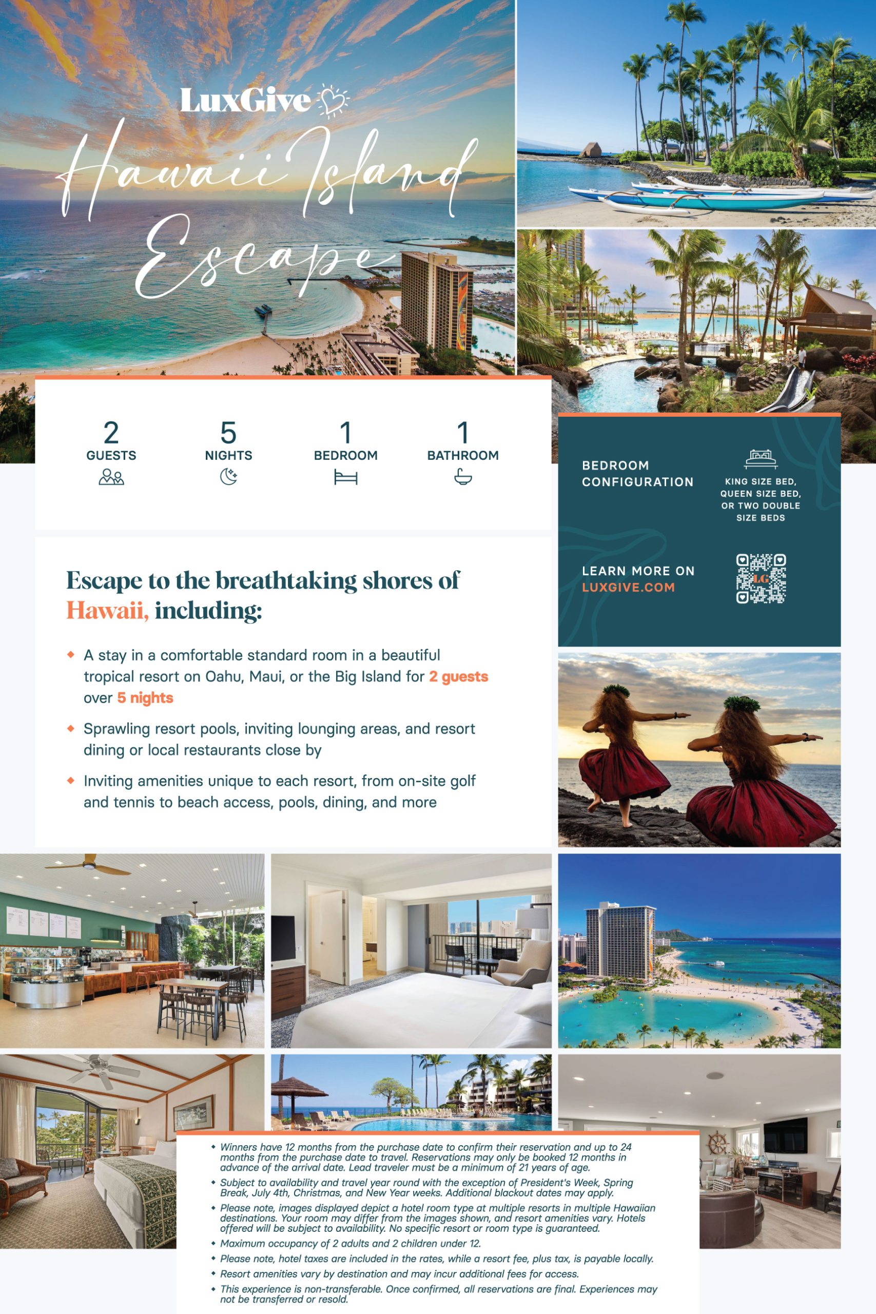 Your Hawaii experience includes 5 nights for 2 adults and 2 children in a welcoming Standard Room at a beautiful resort on Oahu, Maui, or the Big Island.