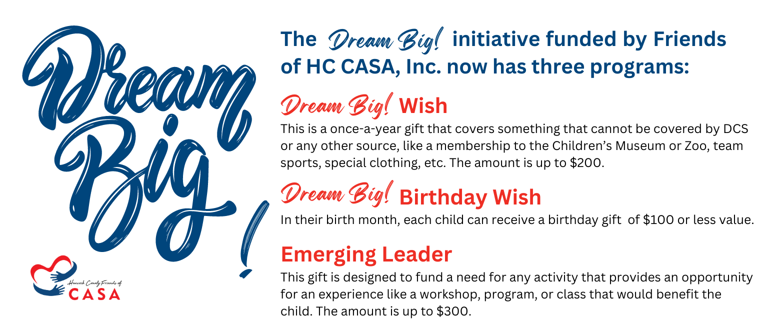 Friends of Hancock County CASA, Inc. (FOC), supports the Hancock County CASA program in its efforts to enrich the lives of abused and neglected children. The Dream Big! fund accomplishes this through raising, managing, and distributing funds to: